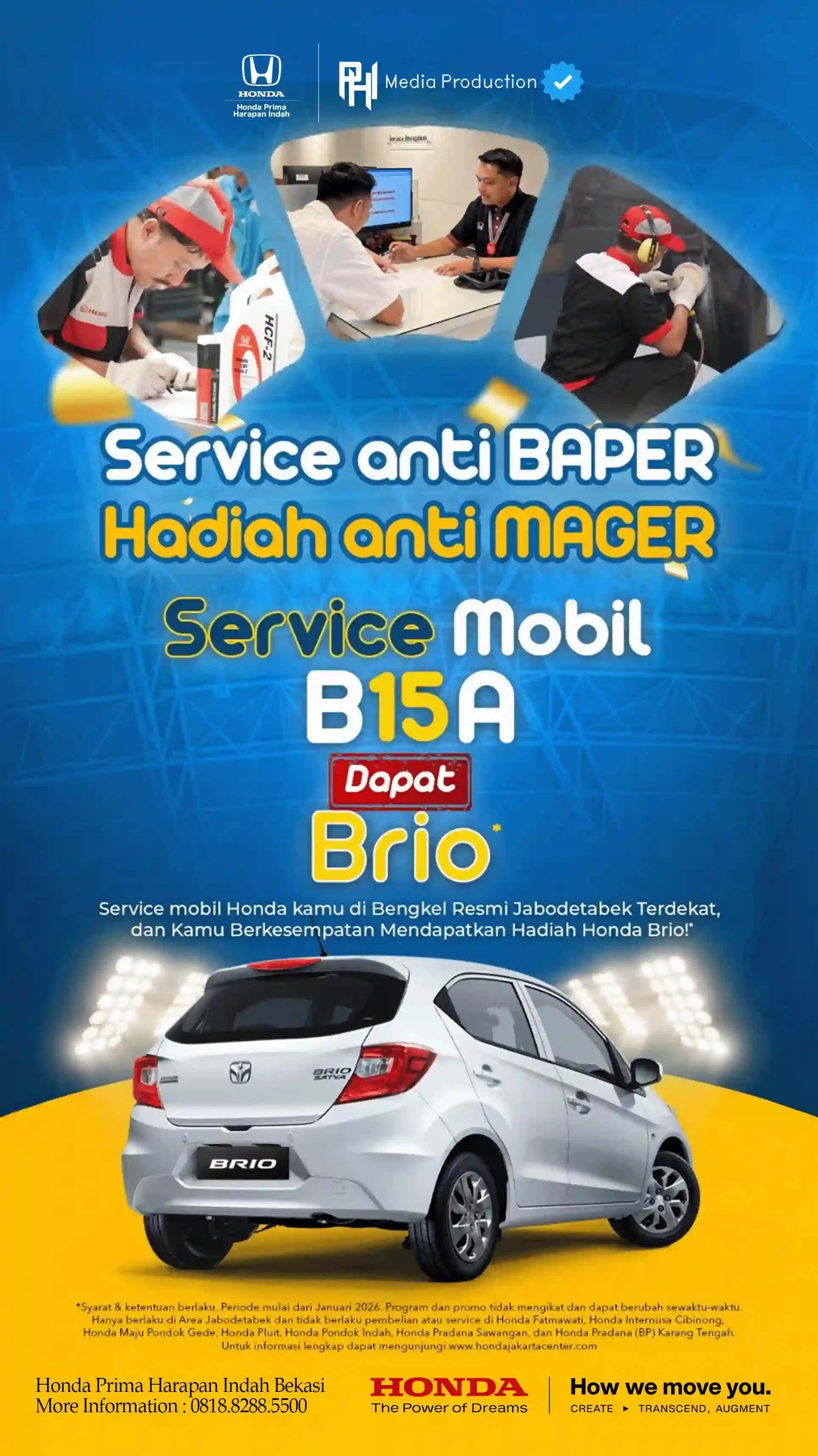 Jangan cuma servis rutin, tapi servis yang bisa bikin kamu dapet MOBIL BARU! Cuma di jaringan dealer resmi Honda (termasuk Honda Prima Harapan Indah Bekasi), setiap perawatan berkala mobil kamu punya peluang bawa pulang Honda Brio!